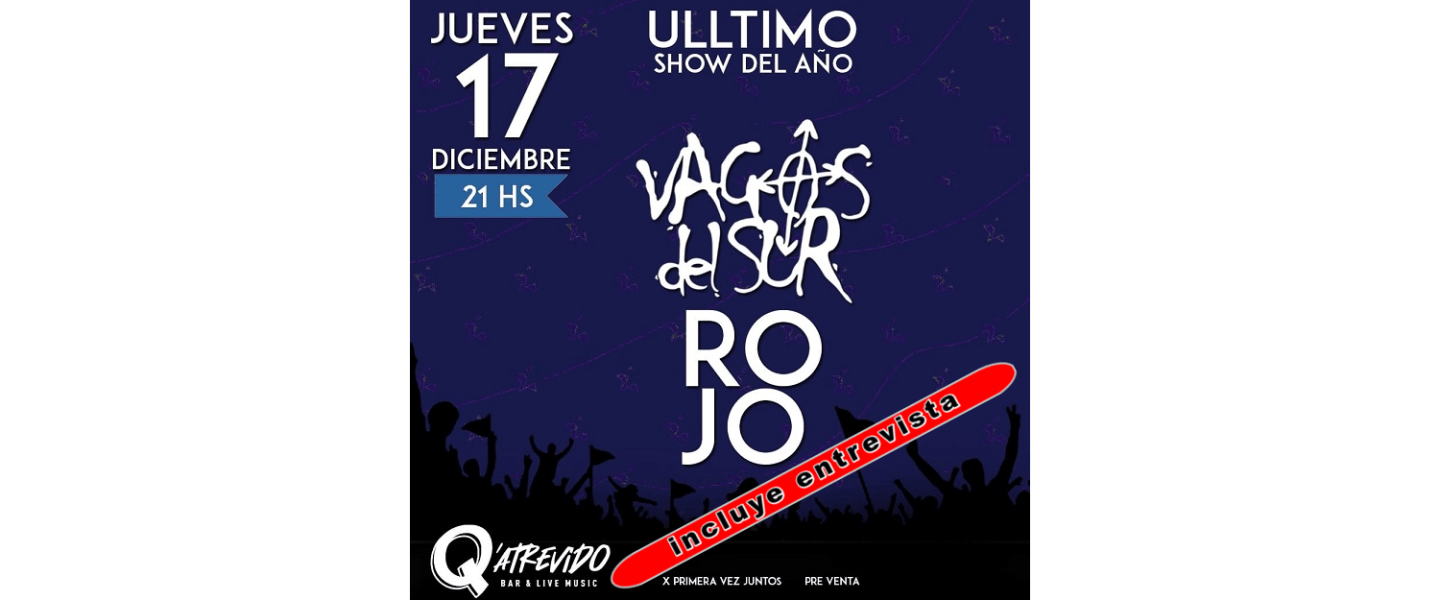 Por primera vez juntos, Rojo (el proyecto de Gonzalo Pasek) y Vagos del Sur. Toda la fuerza de dos bandas de larga trayectoria que se unen para un show imperdible este próximo jueves 17 de diciembre desde las 21 horas en Q’Atrevido Bar (San José y Soriano).